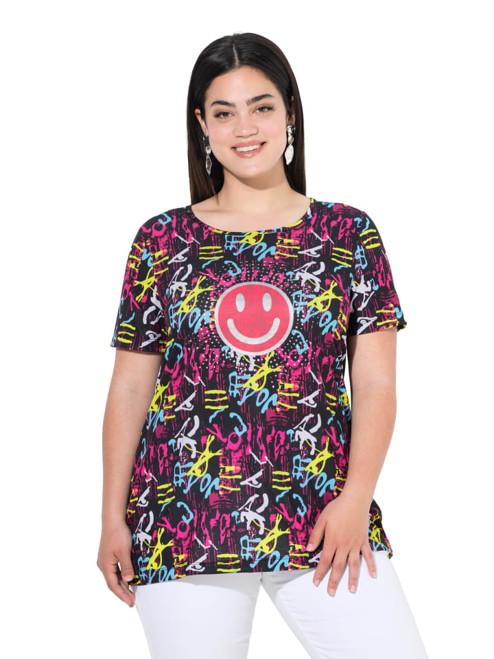 Футболка удобного кроя из мягкого трикотажа с блестящим смайликом на буквенном узоре. Круглый вырез, короткие рукава.