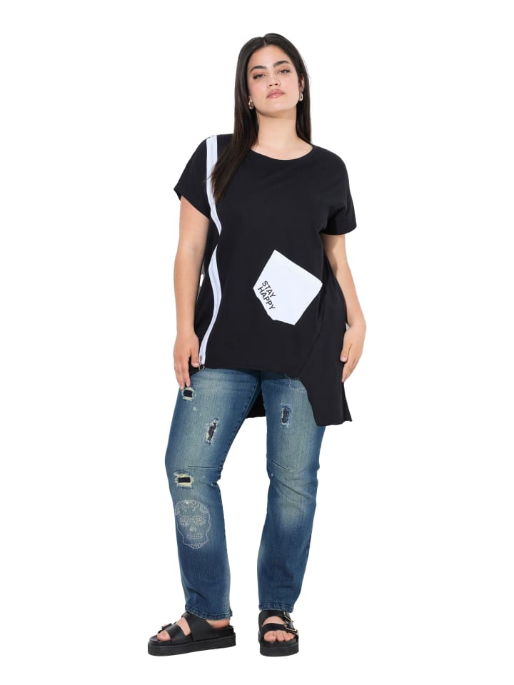 Футболка свободного кроя из мягкого трикотажа с декоративной молнией и накладным карманом. Круглый вырез, спущенная линия плеча, широкие рукава летучая мышь и необработанный край.