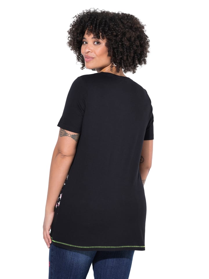 Футболка прямого кроя из мягкого трикотажа с объемным рисунком, звездочками и блестящими камнями. Модные неоновые швы. Круглый вырез, короткие рукава.