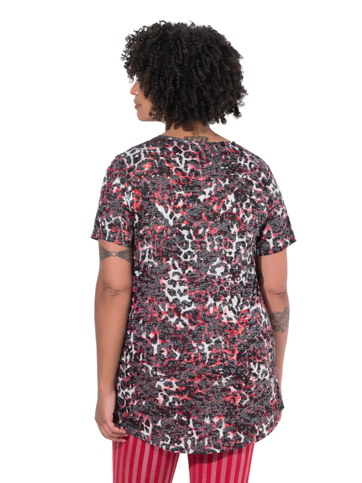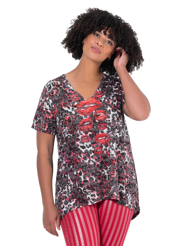 Футболка А-силуэта из мягкого трикотажа с эффектом выжигания, с леопардовым принтом и блестящими стразами на поцелуе. V-образный вырез, короткие рукава. Удлиненный подол сзади.