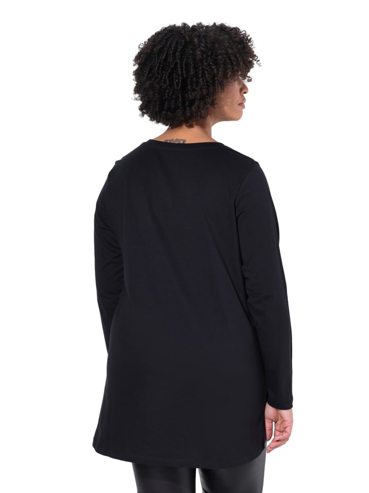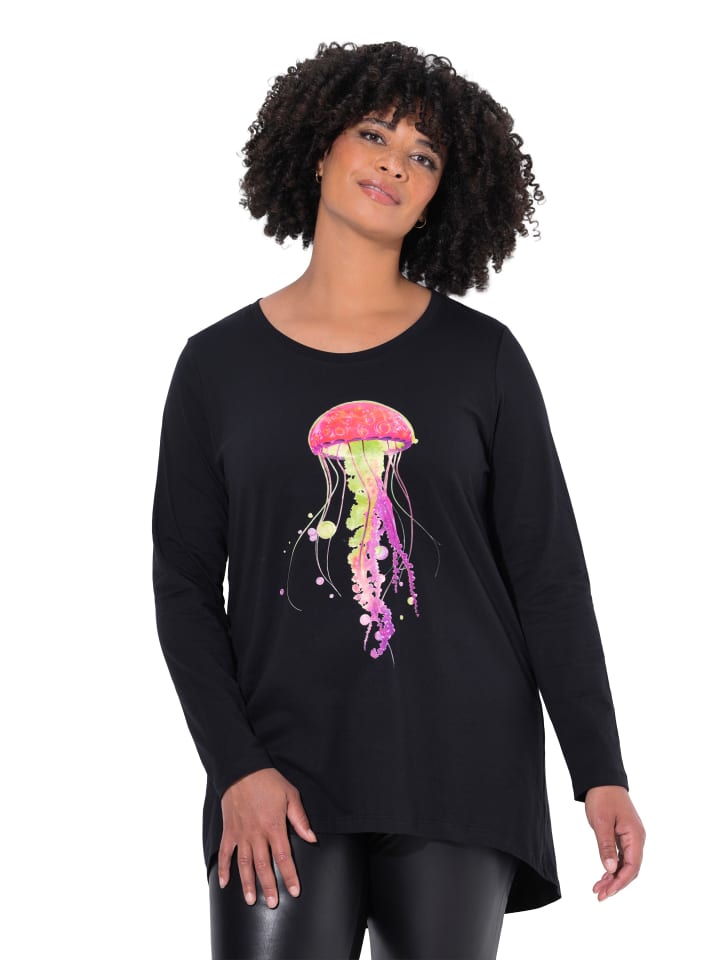 Футболка А-силуэта из мягкого трикотажа с рисунком медузы. Круглый вырез, длинные рукава. Закругленный подол и удлиненная спинка.