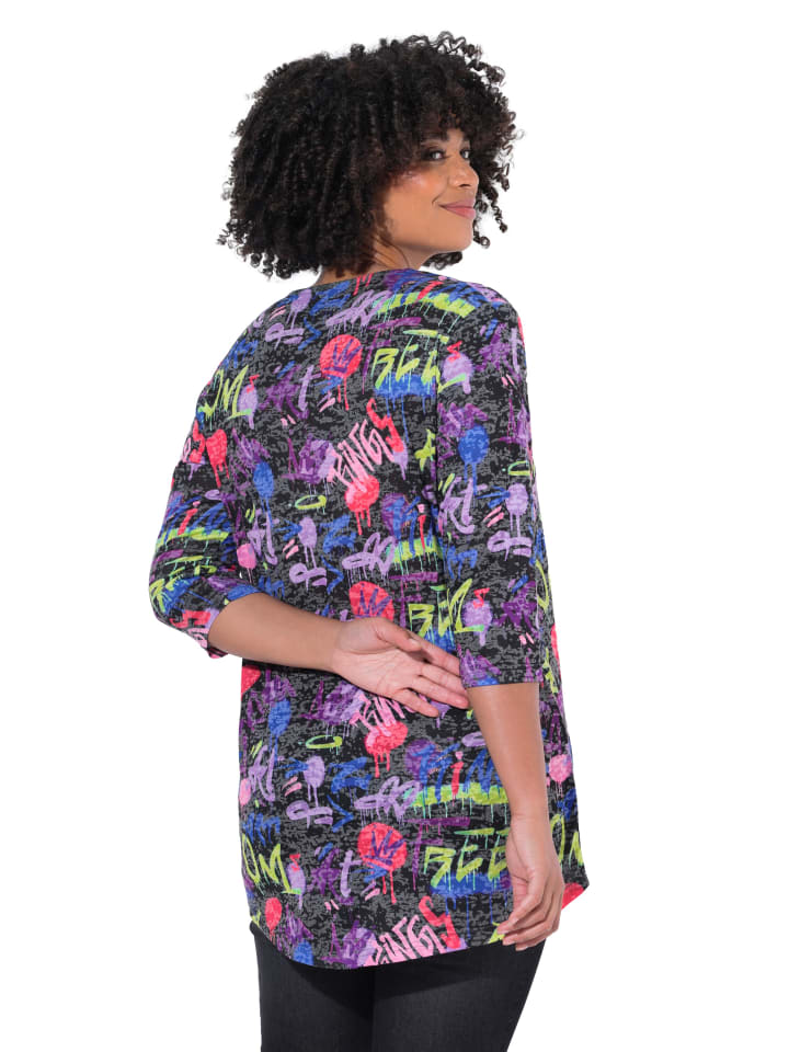 Футболка А-силуэта из мягкого трикотажа с эффектом выжигания, украшенная блестящими камнями на каракульном узоре. V-образный вырез, рукава длиной 3/4. Удлиненный подол сзади.