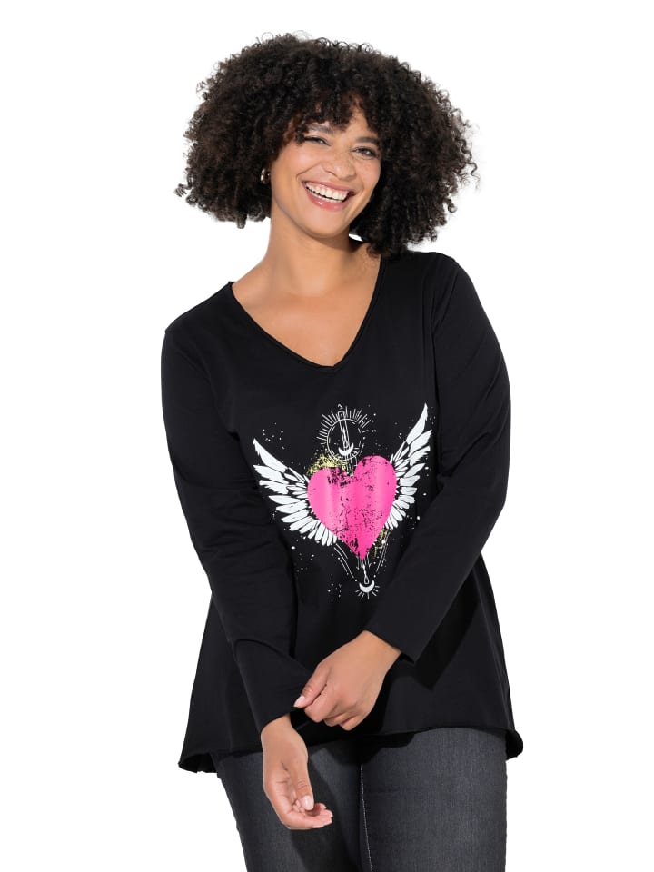 Рубашка А-силуэта с длинными рукавами из мягкого трикотажа с крупным рисунком в виде сердца и необработанными краями. V-образный вырез, удлиненный подол сзади.