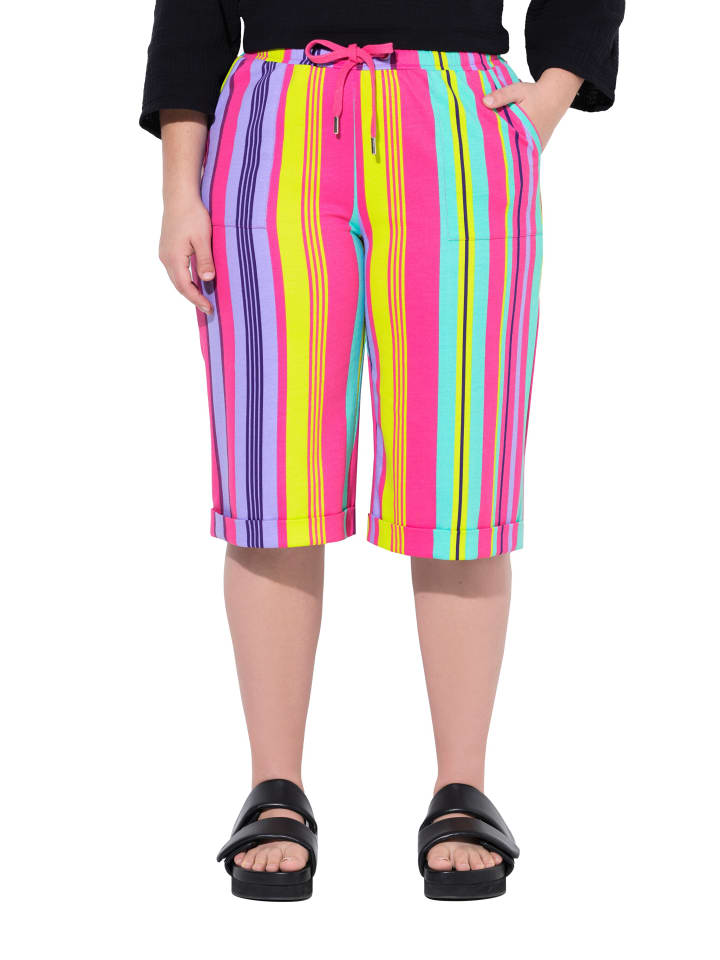 Спортивные шорты-бермуды, удобной посадки, из мягкой трикотажной ткани с полосками. Эластичный пояс со шнурком, два боковых кармана и фиксированный нижний край.