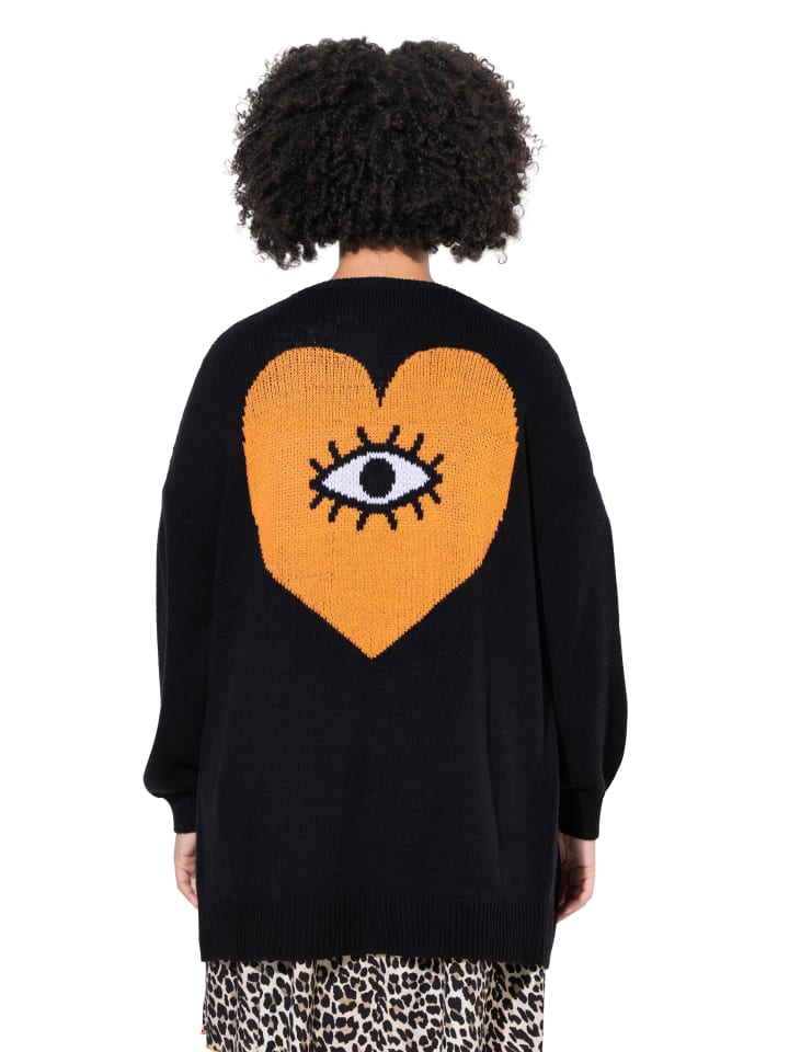 Кардиган прямого кроя из мягкой пряжи крупной вязки с крупным узором глаз-сердце на спинке. Расстегнутая куртка со спущенной линией плеча, широкими рукавами-фонариками и ребристыми манжетами.