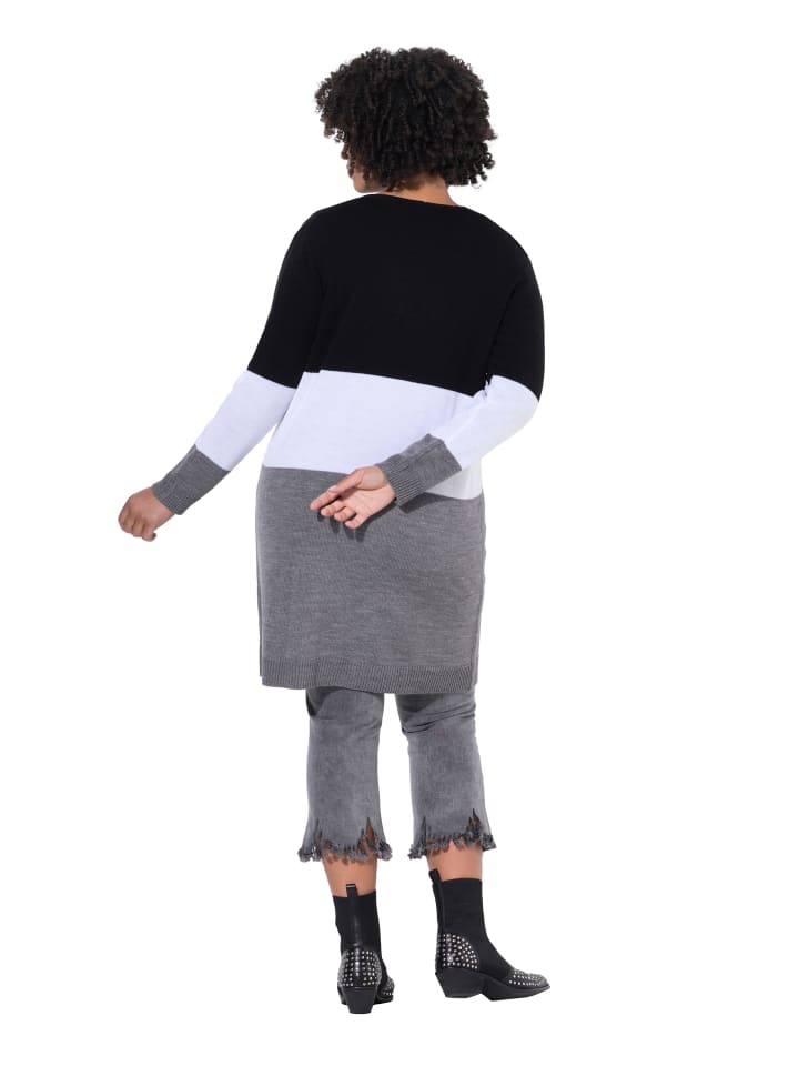 Длинный кардиган, удлиненный, удобного кроя, из мягкой тонкой вязки с блочными полосками. Свободный, свободный крой, длинные рукава. Манжеты на резинке.