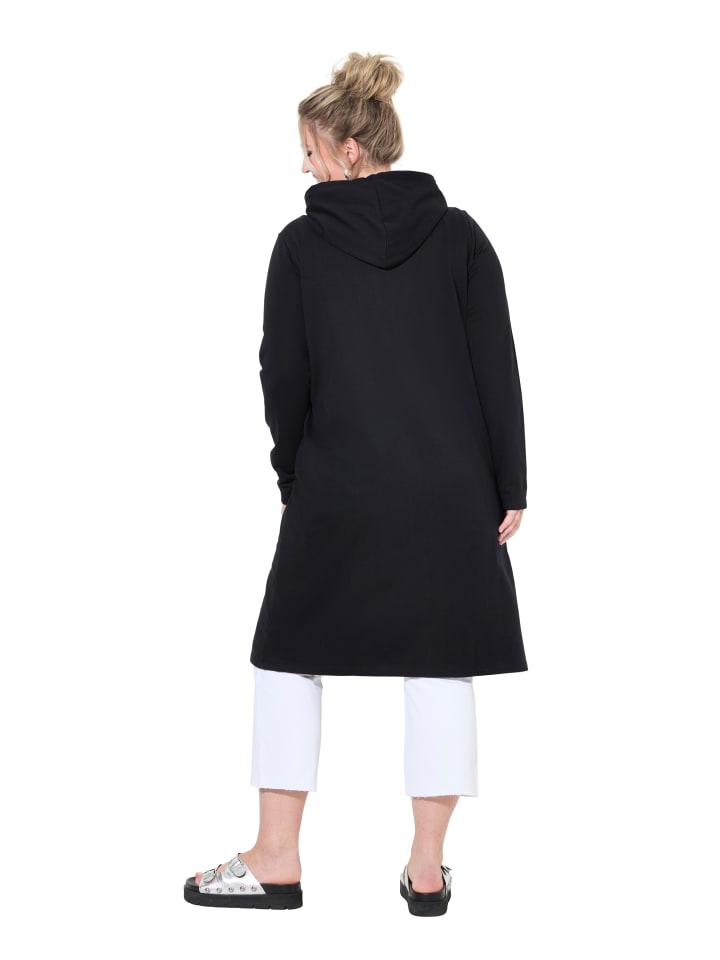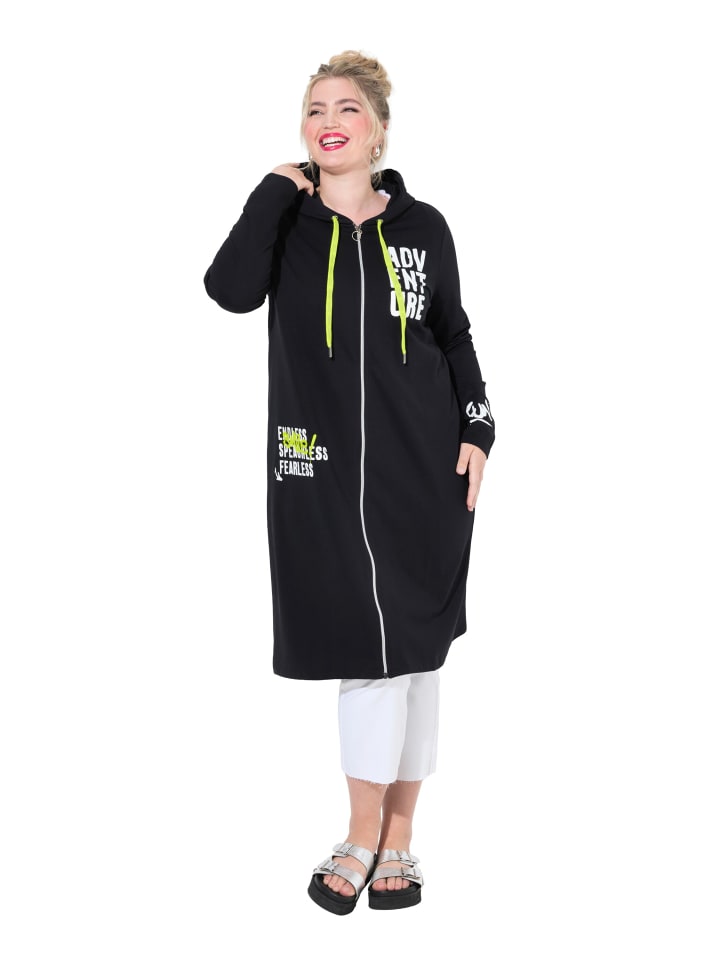 Толстовка А-силуэта с эффектными принтами. Капюшон с завязками, молния, длинные рукава.