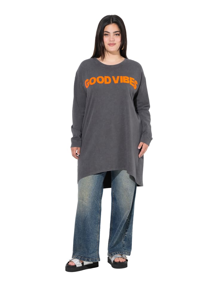 Толстовка свободного кроя из мягкой трикотажной ткани с кислотной стиркой для создания современного винтажного образа. Крупная махровая надпись. Круглый вырез, спущенная линия плеча и длинные рукава с ребристыми манжетами. Внешний материал: 100% хлопок.