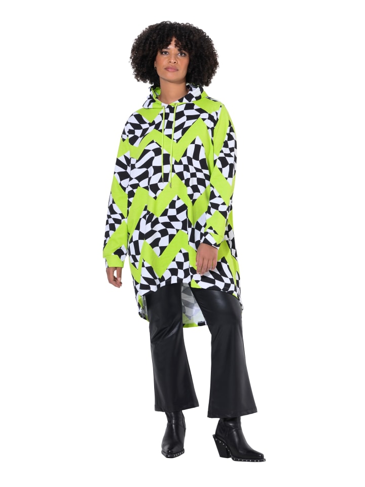 Толстовка оверсайз из мягкой трикотажной ткани с ярким шахматным узором. Капюшон, длинные рукава с ребристыми манжетами. Удлиненный подол сзади.