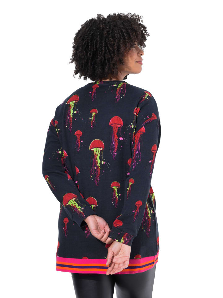 Толстовка свободного кроя из мягкой трикотажной ткани с рисунком медуз. Круглый вырез, спущенная линия плеча, длинные рукава и манжеты с резинкой и полосками. Внешний материал: 100% хлопок.