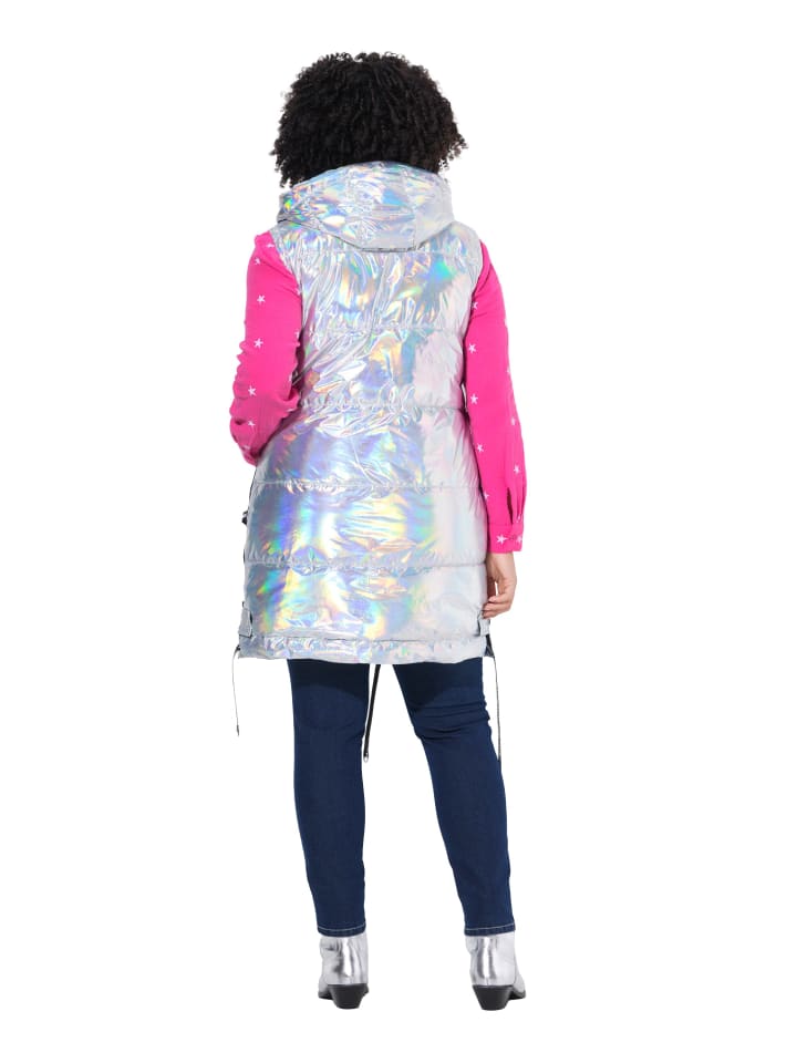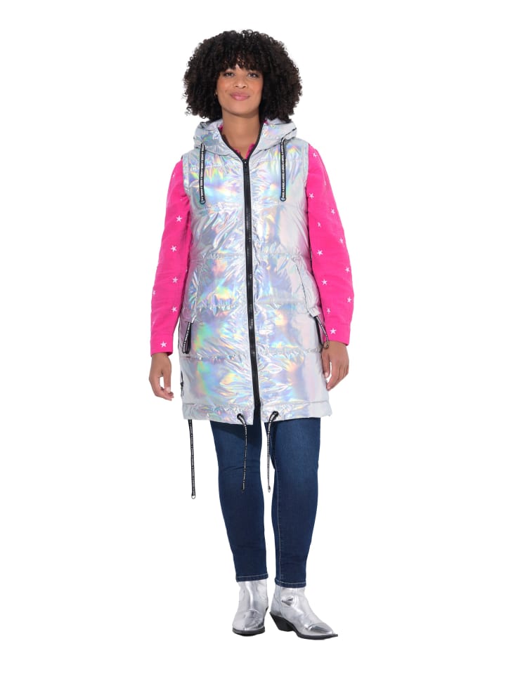 Длинный стеганый жилет А-силуэта из легкой стеганой ткани. С капюшоном, застежкой-молнией с декоративными лентами и двумя карманами. Боковые разрезы на молнии обеспечивают еще большую свободу движений.