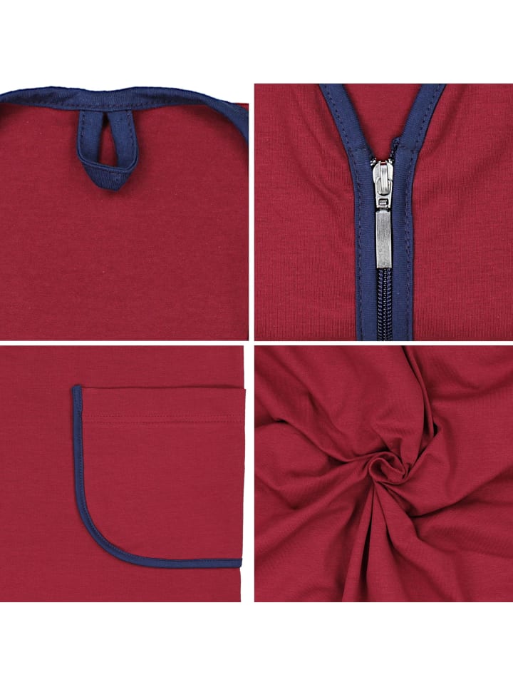 Этот модный женский халат длиной до колена от Aquarti изготовлен из легкого и приятного для кожи материала с добавлением эластичных волокон. Хлопковая ткань с небольшим добавлением эластана проста в уходе и приятно прилегает к коже. Свободный крой халата обеспечивает максимальный комфорт и свободу движений. Халат с рукавами 3/4 также имеет два кармана для хранения мелких вещей. Молния по всей длине обеспечивает оптимальный комфорт и практичность. Женские халаты доступны в красивых цветах, таких как амарантовый, синий, темно-синий, пестрый серый, пудрово-розовый и бирюзовый. Халат также имеет контрастную отделку. Сделано в ЕС.