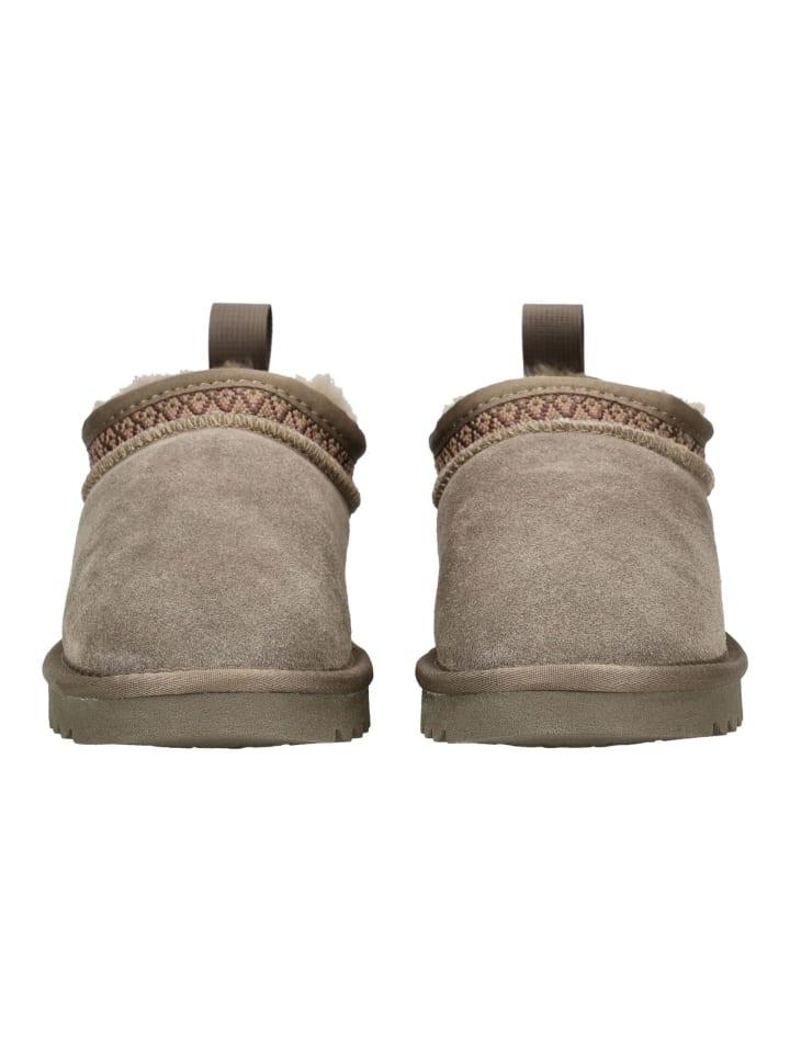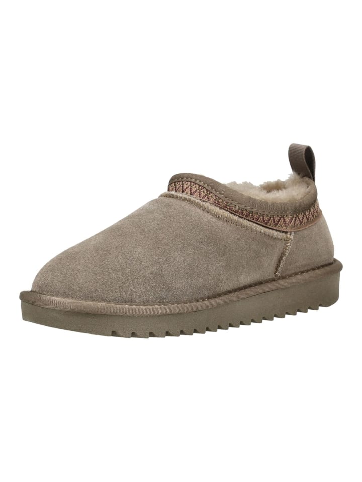 Эти тапочки из прочной замши с мягкой подкладкой из овчины обеспечат ногам тепло и высокий комфорт. Легкая профилированная подошва обеспечивает надежное сцепление, а изящная декоративная отделка по краю голенища добавляет стильный акцент - идеально для уютных домашних часов.