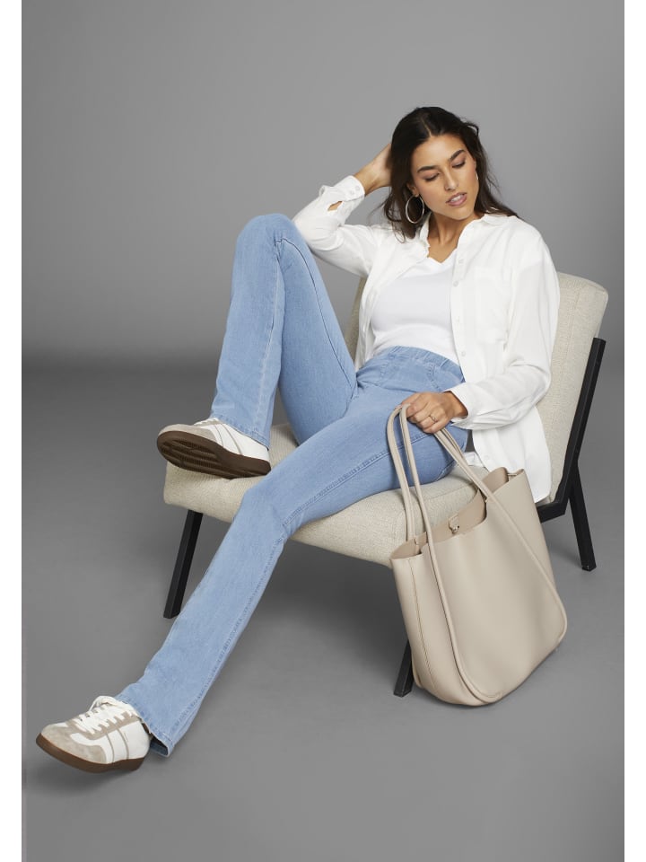 Облегающие женские джинсовые леггинсы от бренда Arizona. Узкий крой, расширяющийся от колена, и высокая посадка. Прочный и долговечный деним делает брюки простыми в уходе.