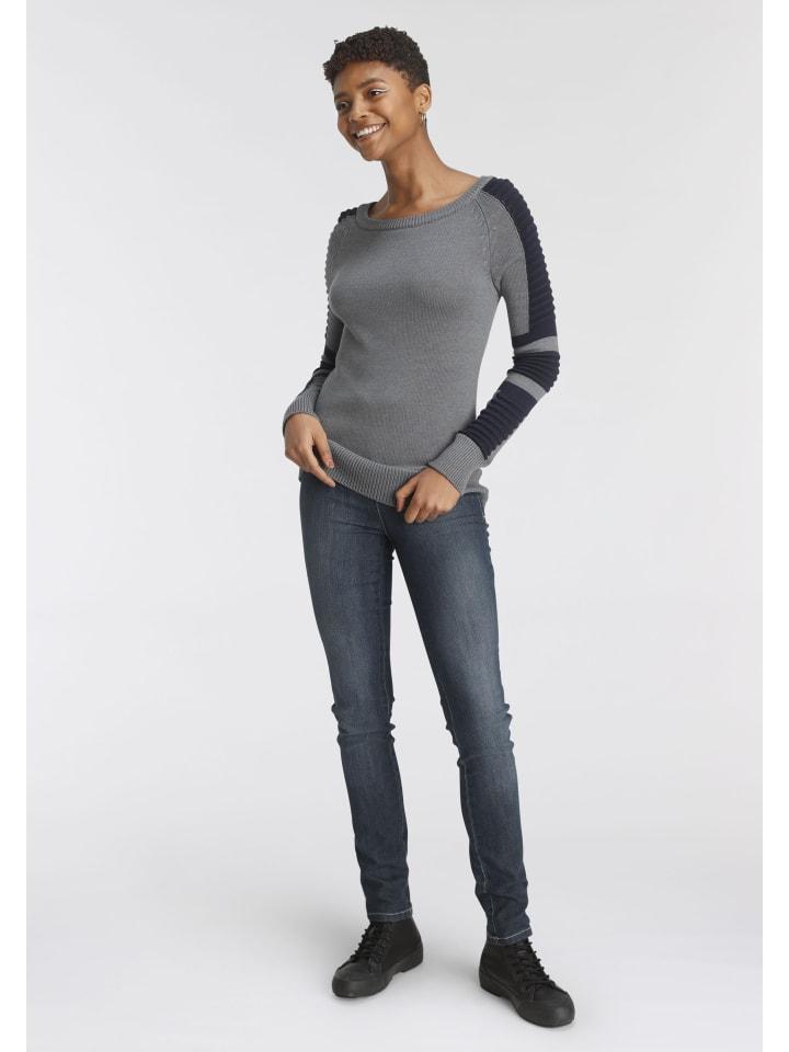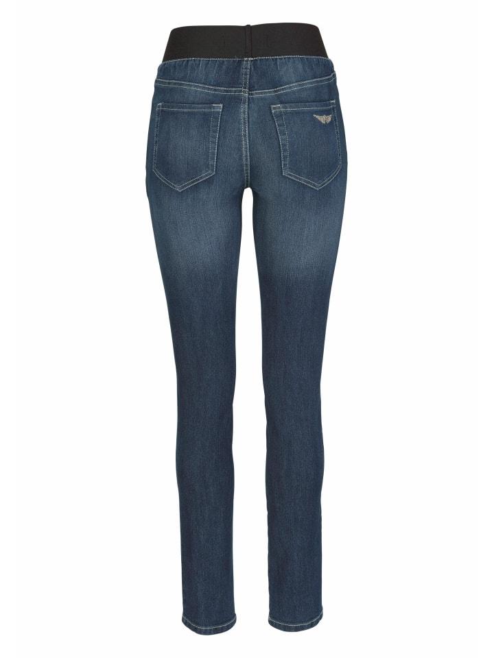 Эластичный пояс, ложные карманы спереди и сзади, следы потертости на бедрах и ягодицах, этикетка на заднем кармане. Удобный эластичный деним.