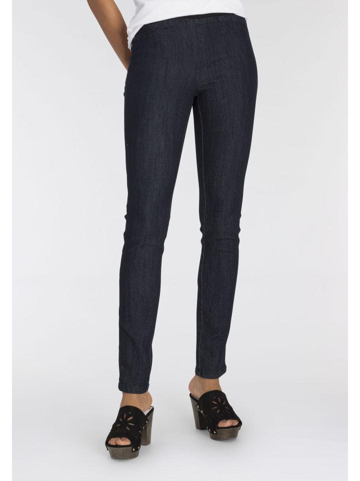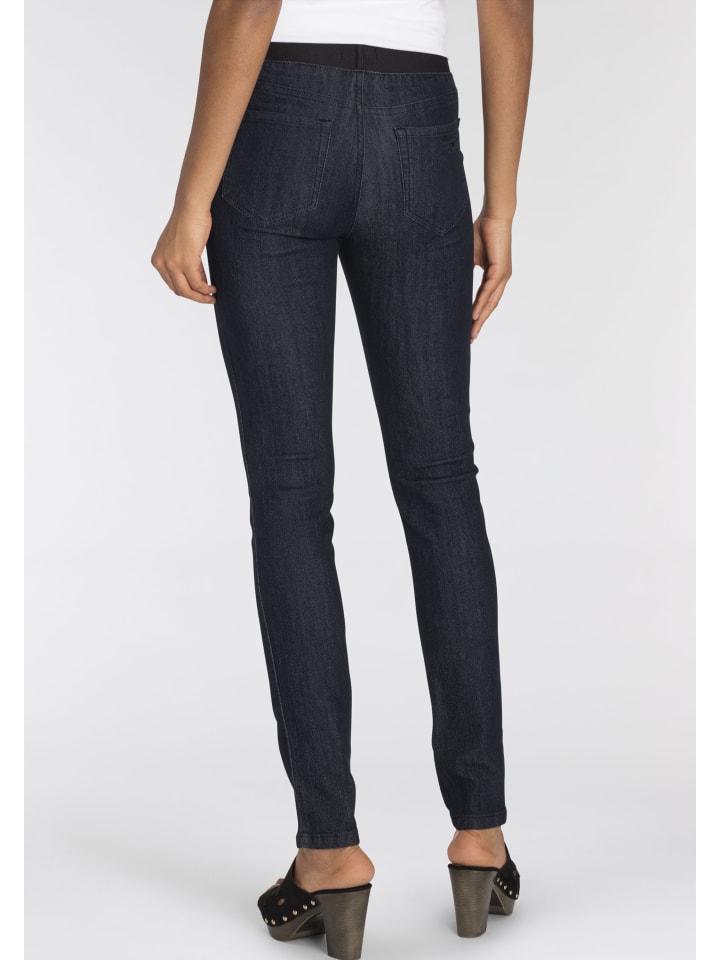 Эластичный пояс, ложные карманы спереди и сзади, следы потертости на бедрах и ягодицах, этикетка на заднем кармане. Удобный эластичный деним.