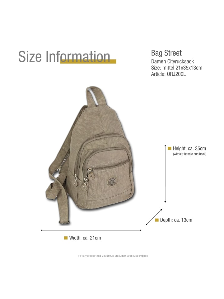 Этот элегантный и стильный женский и молодежный рюкзак от бренда Bag Street с артикулом ORJ200L имеет размеры - 35 см x 13 см x 21 см-. Этот красивый рюкзак для отдыха светло-коричневого цвета, изготовлен из нейлона и застегивается на молнию.