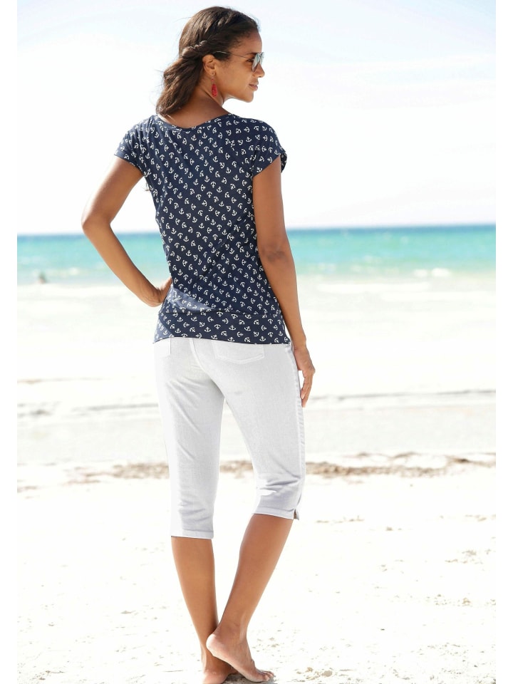 Капри с пятью карманами. С небольшими разрезами по бокам штанины. Длина по внутреннему шву примерно 44,5 см. Изготовлены из 98% хлопка, 2% эластана.