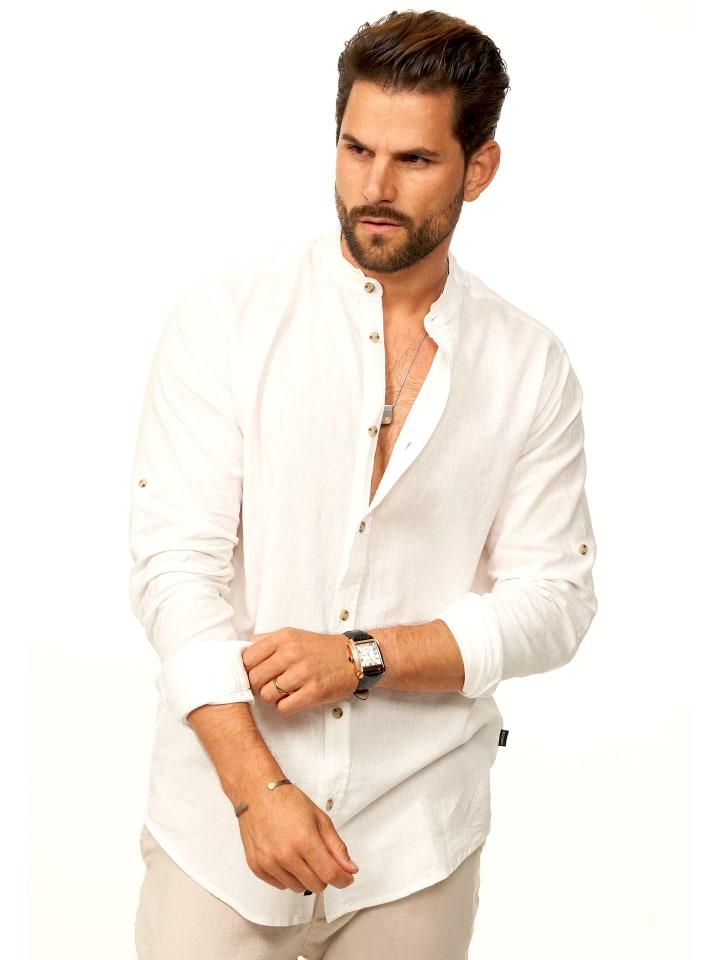 Современный воротник-стойка, длинная планка с пуговицами и приталенный крой делают эту рубашку универсальным аксессуаром - можно носить с чиносами, льняными брюками или джинсами.