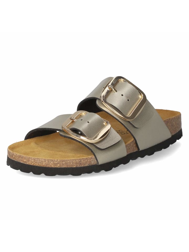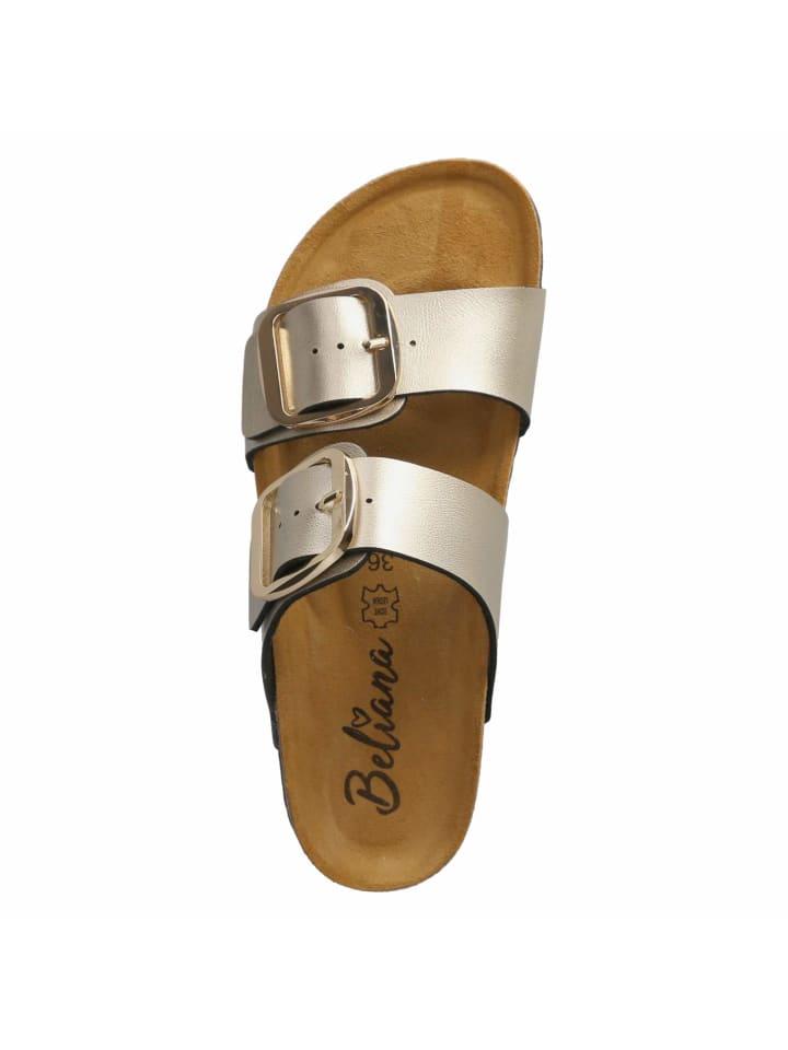 Женские мюли Beliana золотистого цвета из высококачественной искусственной кожи стильно смотрятся благодаря элегантному золотистому мерцанию. Два широких декоративных ремешка и две регулируемые золотистые пряжки не только обеспечивают элегантный вид, но и обеспечивают индивидуальную посадку и надежную фиксацию. Формованная мягкая кожаная стелька удобно адаптируется к форме стопы и обеспечивает ощутимый комфорт - идеально для повседневной носки или летнего отдыха. Гибкая подошва обеспечивает плавный ход и уверенное передвижение по различным поверхностям. Эти мюли сочетают в себе модный дизайн с функциональностью и станут отличным выбором для теплых дней.