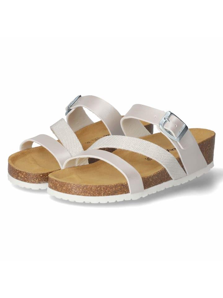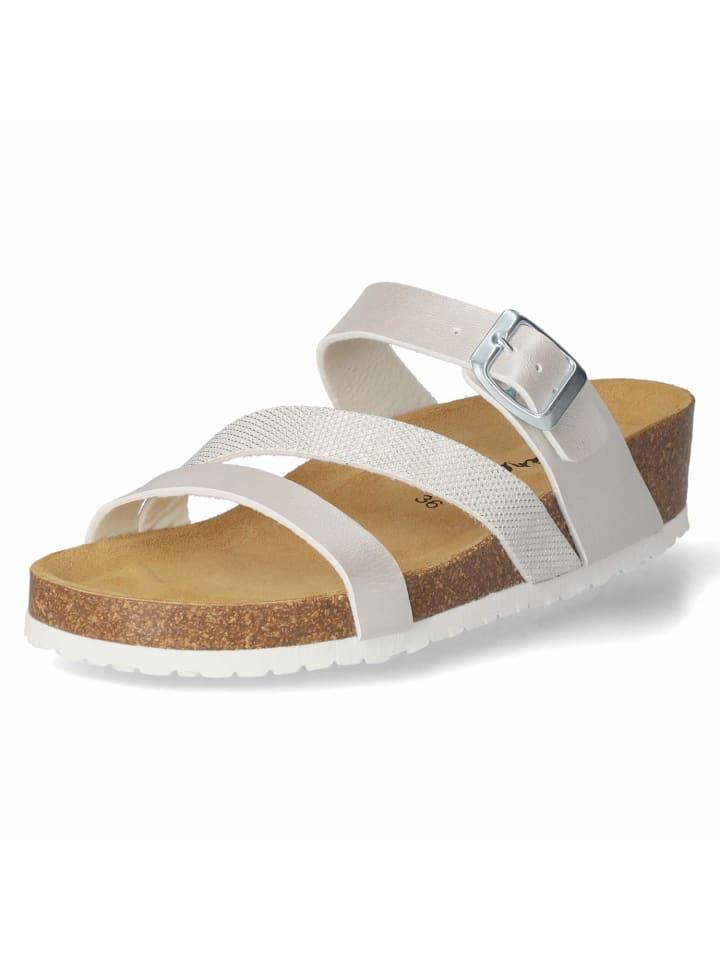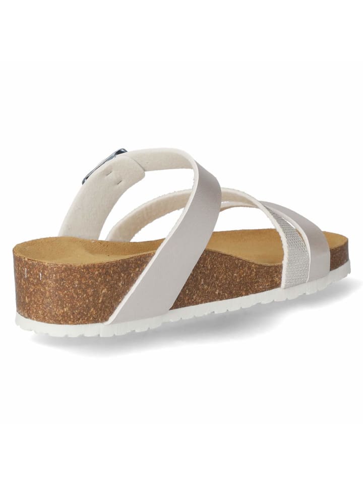 Женские мюли Beliana серебристого цвета из блестящей искусственной кожи - стильный спутник для теплых дней. Они оснащены тремя декоративными ремешками, один из которых украшен эффектным переплетением металлизированных нитей, что привлекает внимание и добавляет модные акценты. Серебристая пряжка позволяет регулировать посадку для максимального комфорта. Формованная мягкая кожаная стелька обеспечивает комфорт и поддержку стопы при каждом шаге. Гибкая подошва с небольшим клиновидным каблуком обеспечивает устойчивость и визуально удлиняет силуэт. Идеально подходит для тех, кто хочет совместить комфорт и стиль.