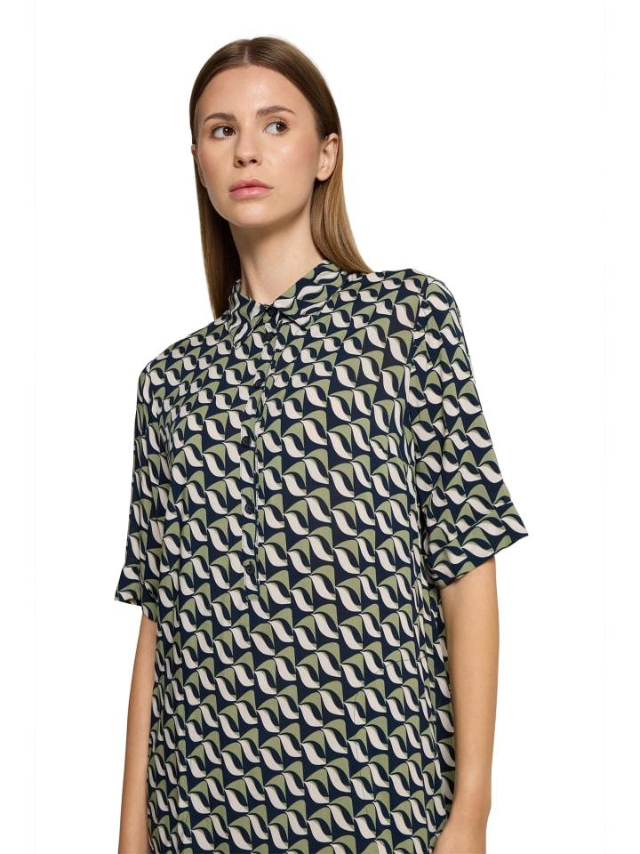 Это облегающее платье-рубашка впечатляет тонким минималистичным узором и свободным кроем, идеально сочетающим свободу движений и стиль. Классическая планка на пуговицах обеспечивает вневременной образ, а практичные карманы в швах придают платью нотку повседневности. Идеально подходит для отдыха и повседневной носки - просто, модно и удобно.