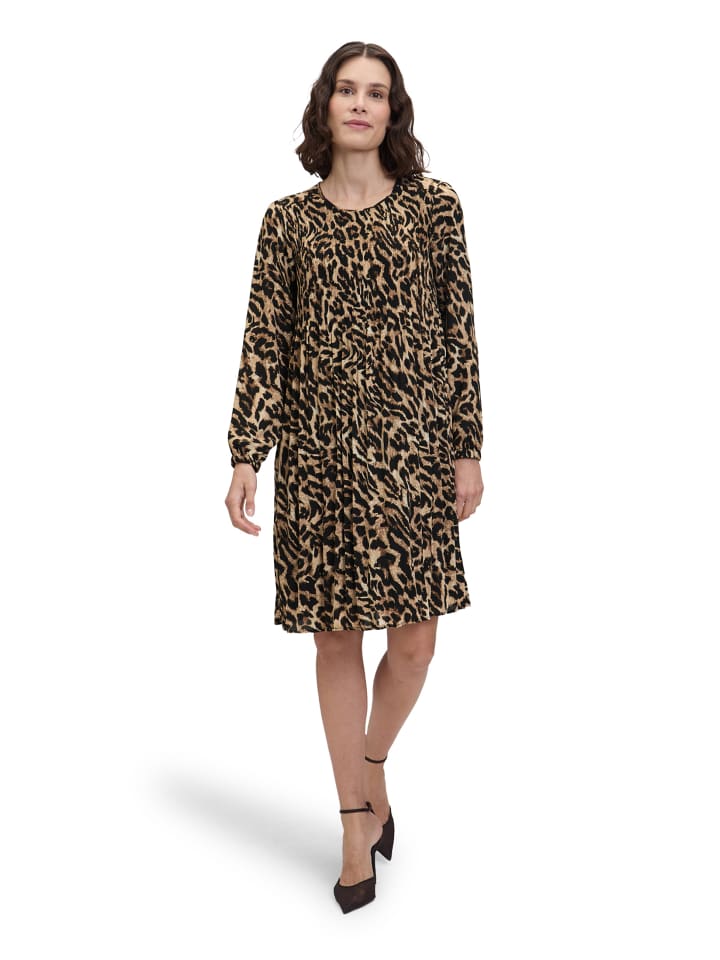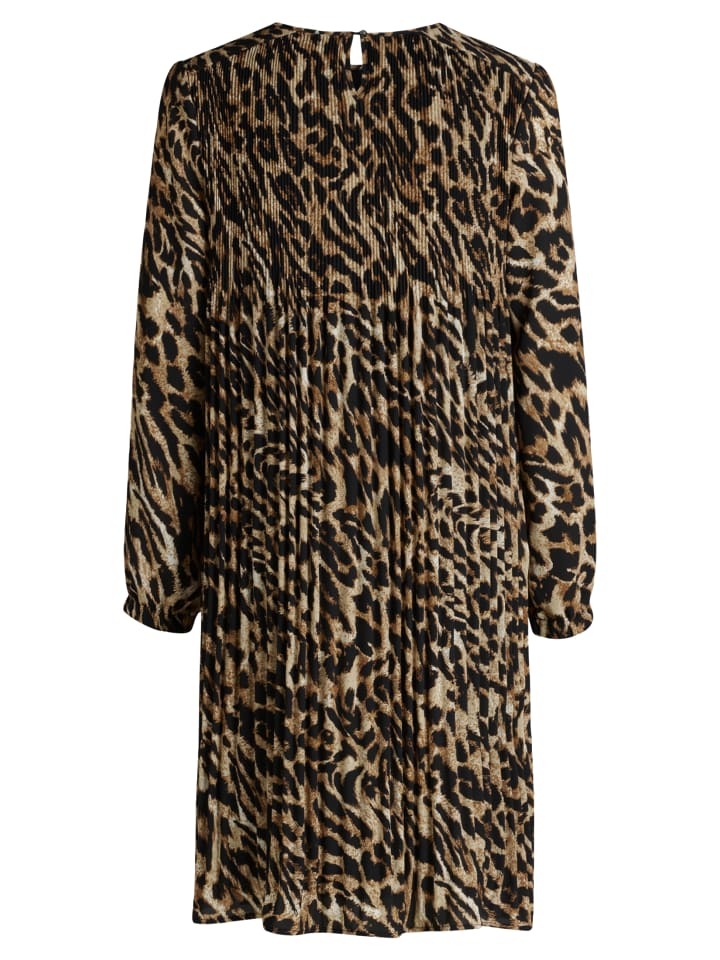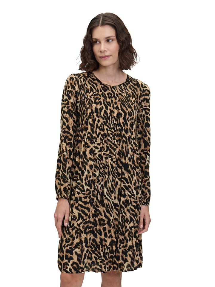 Это плиссированное платье впечатляет своим мягким, струящимся материалом, который обеспечивает комфортную носку и создает элегантный силуэт. Модный анималистичный принт придает платью модный штрих, который можно комбинировать по-разному. Практичная петля для пуговиц сзади делает его особенно привлекательным и позволяет легко надевать и снимать. Идеально подходит для расслабленных городских дней или путешествий.