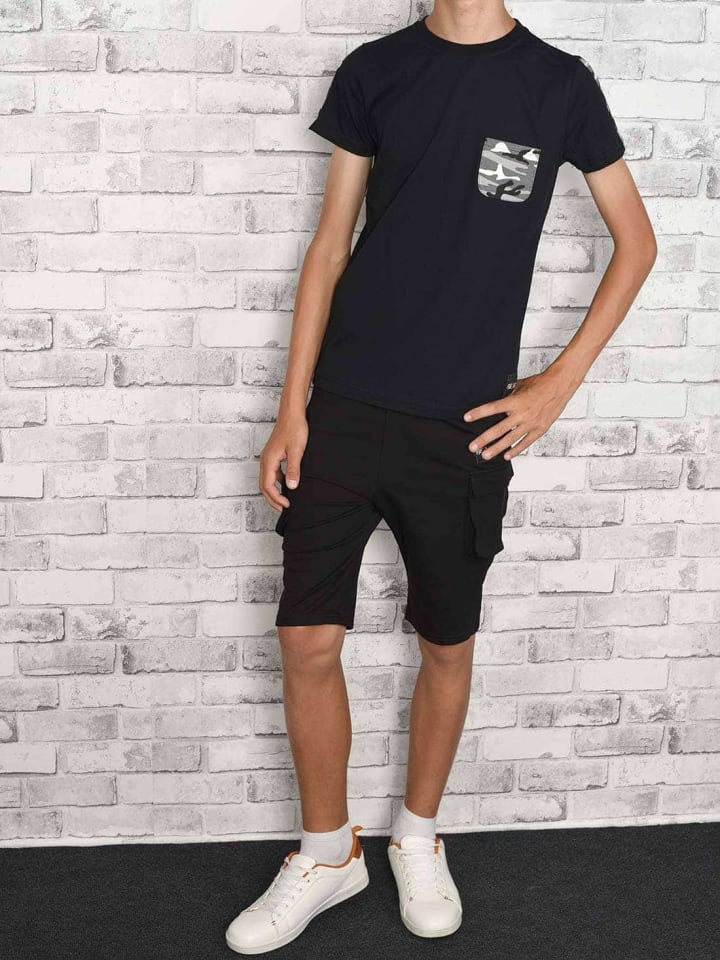 Этот летний детский комплект одежды для мальчиков от Bezlit состоит из свободной футболки с симпатичным нагрудным карманом и вставками в тон на рукавах. В комплект также входят шорты для мальчиков с эластичным поясом и двумя боковыми карманами.