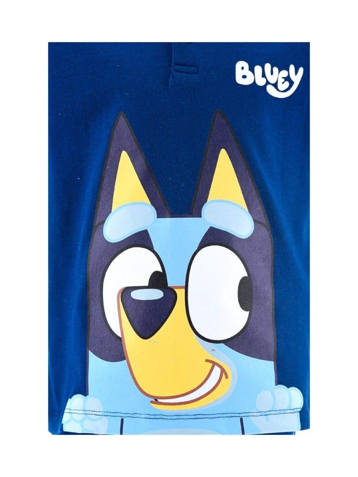 Футболка с изображением Bluey украшена крупным принтом персонажа и застегивается на небольшую планку с пуговицами на горловине.