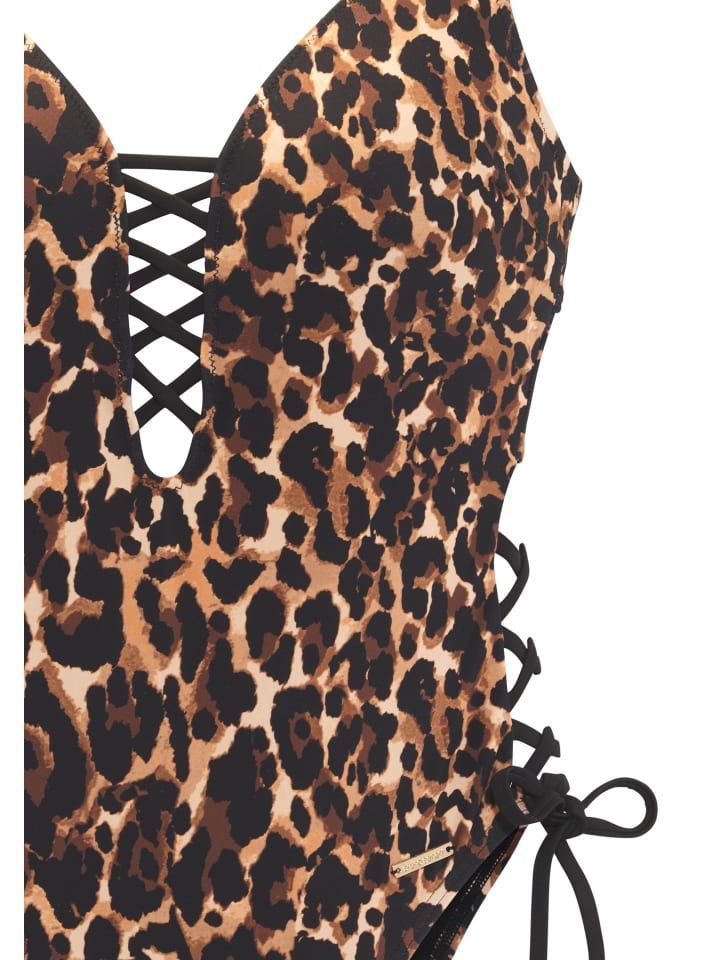 Восхитительный купальник от Bruno Banani. Сплошной леопардовый принт, кружевные детали по бокам и глубокий V-образный вырез. Чашечки с подкладками. Регулируемые бретели. Эластичная ткань с добавлением переработанного полиамида.