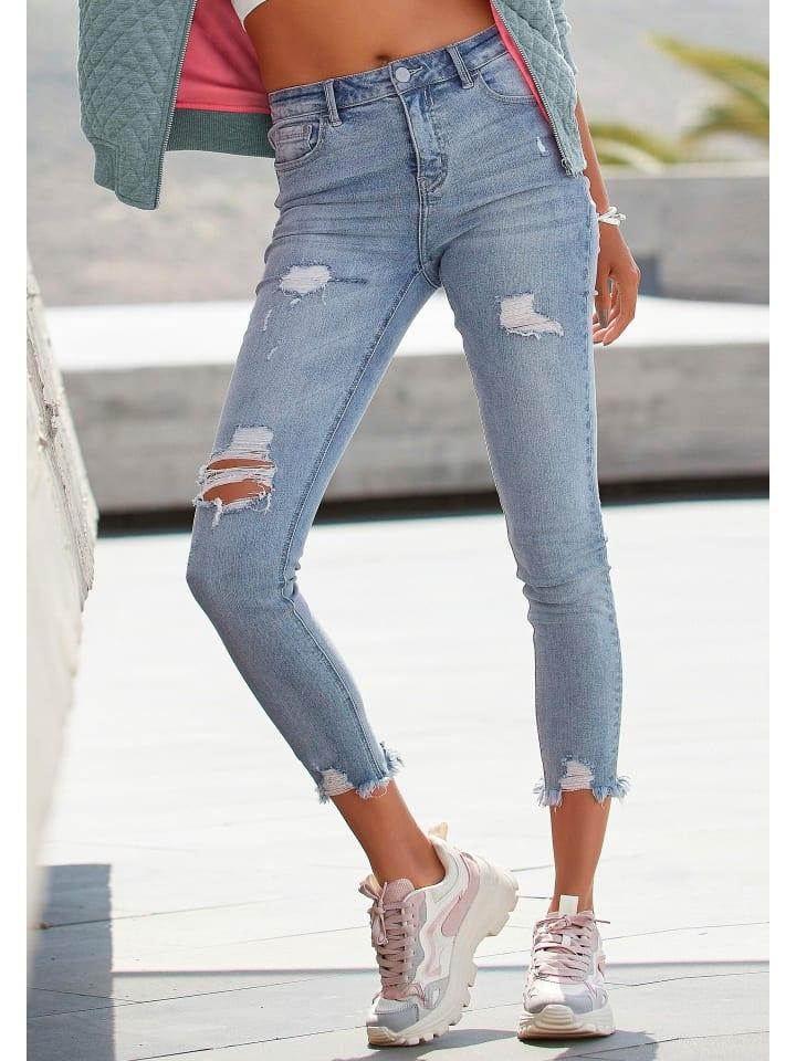 Джинсы BUFFALO с эффектом потертости и рваными краями. Зауженный крой с пятью карманами. Длина по внутреннему шву примерно 70 см. Состав: 98% хлопок, 2% эластан.