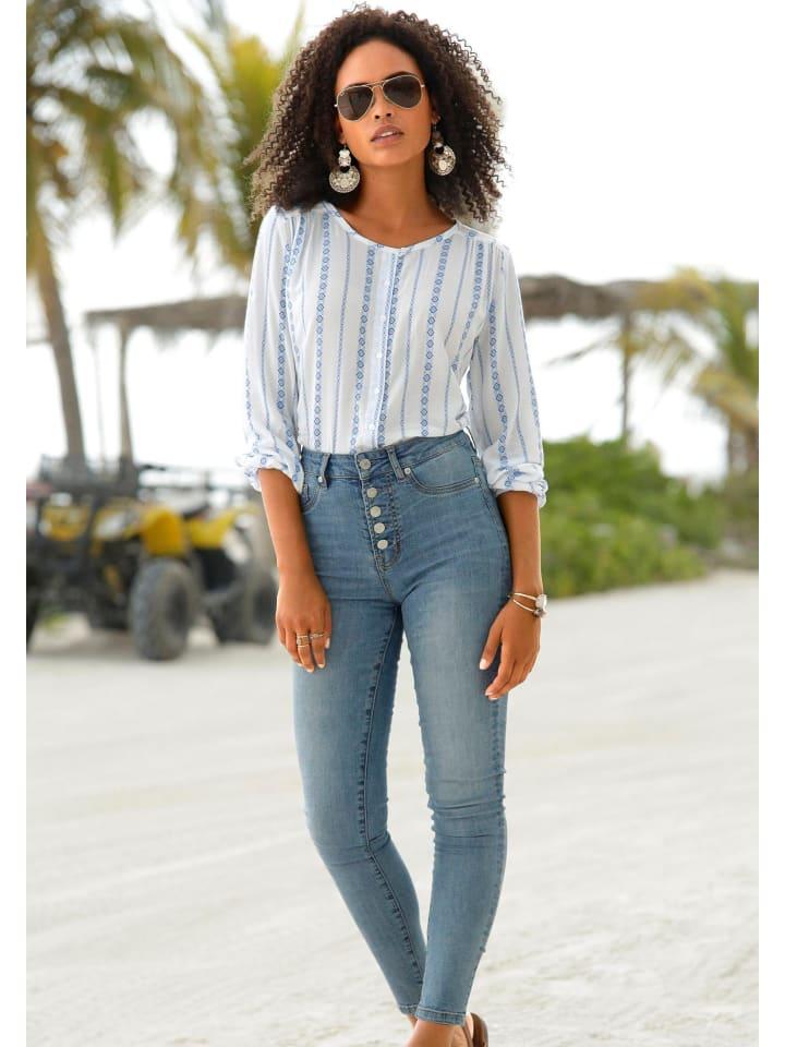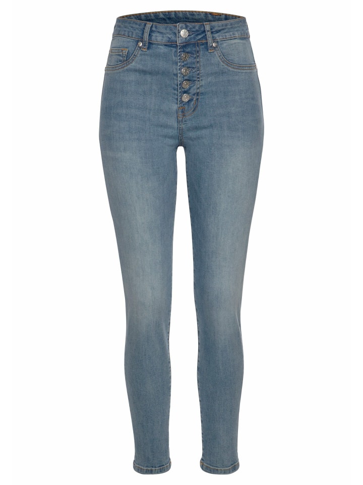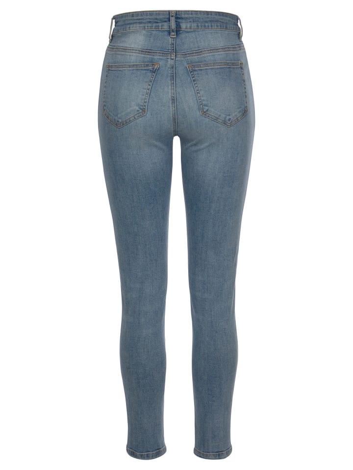 Джинсы с высокой талией от Buffalo. Очень высокая талия со шлевками для ремня и 5 пуговицами. Модель с пятью карманами, передними и задними карманами. Узкие штанины. Длина по внутреннему шву примерно 73 см. Состав: 97% хлопок, 3% эластан.