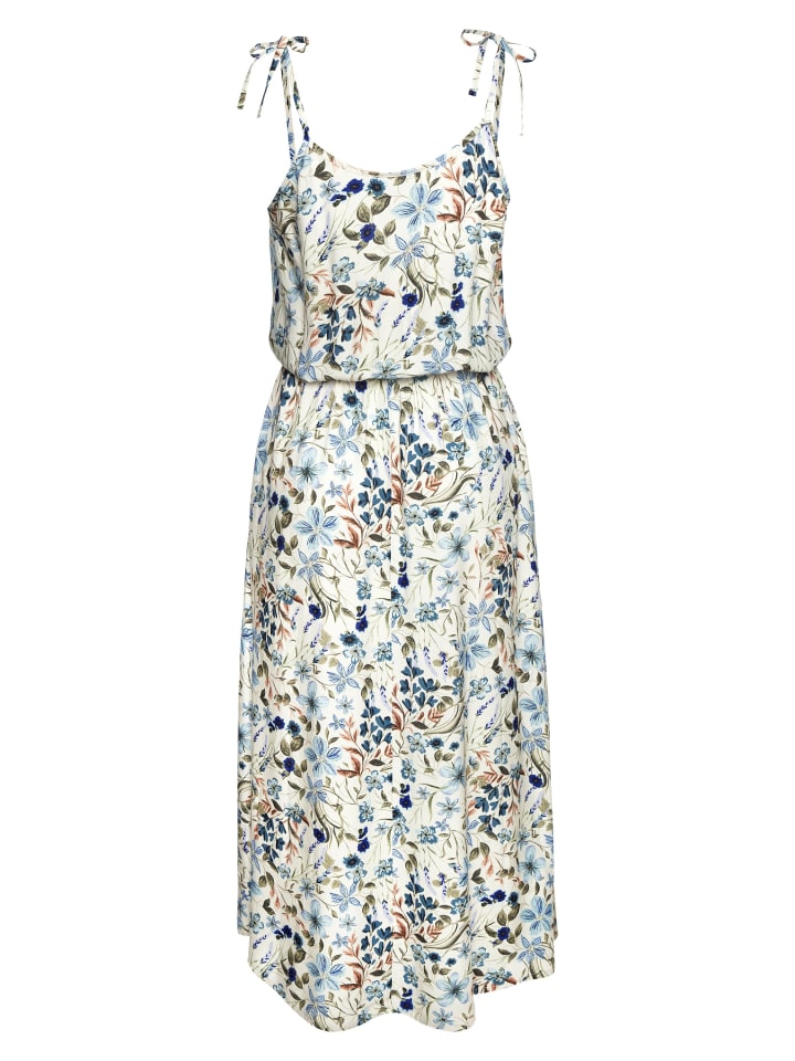 Летнее платье от Buffalo с принтом и круглым вырезом. Тонкие бретельки, которые можно завязать на плече. Эластичная талия. Практичные карманы в боковых швах. Длина чуть выше щиколотки. Изготовлено из легкой вискозной ткани.