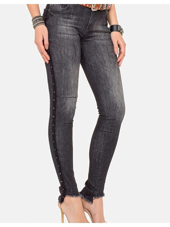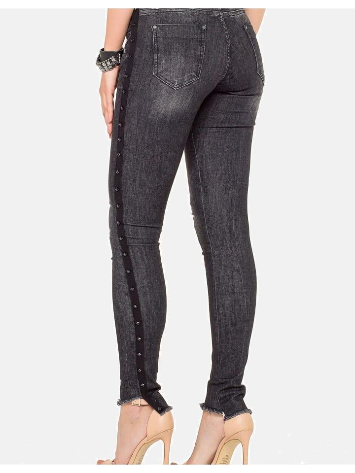 Эти повседневные джинсы скинни в байкерском стиле рок-шик украшены вышивкой и деталями в виде барабана. Боковые панели, отделанные декоративными заклепками, делают брюки центральным элементом. Асимметричный крой и потертые носки с ремешком на щиколотке дополняют повседневный и спортивный образ.