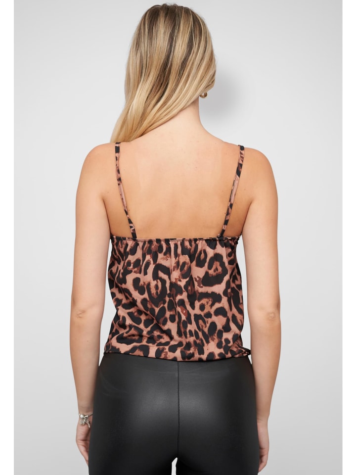 Эта рубашка с короткими рукавами идеально подходит в качестве легкого повседневного слоя. Она имеет круглый вырез, тонко регулируемые бретельки-спагетти и узел спереди, который добавляет женственности. Классический крой обеспечивает свободную посадку, а стандартную длину можно легко заправить за пояс или брюки, создавая четкий силуэт. Гладкий, слегка эластичный полиэстеровый трикотаж обеспечивает комфортную свободу движений и драпировку, а анималистичный принт придает верху эффектный вид. Эта модель, не требующая особого ухода и хорошо сохраняющая форму, отлично сочетается как с повседневными, так и с элегантными нарядами, а также может стать универсальным элементом многослойной одежды.