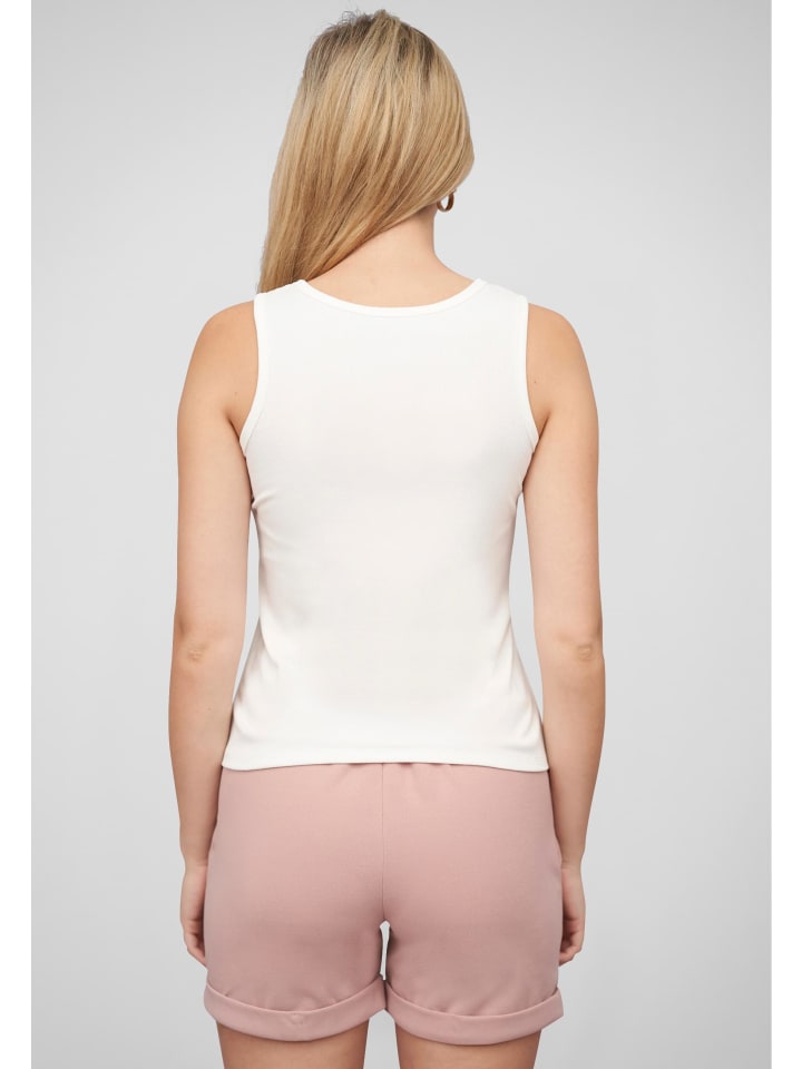 Эта майка прямого кроя, идеально подходящая в качестве легкого повседневного слоя или для офиса в теплые дни, имеет тонкую ребристую структуру и изящную планку на пуговицах на V-образном вырезе. Безрукавка облегает тело и имеет стандартную длину, что делает ее идеальной для ношения под блейзерами или с повседневными брюками. Принт в виде перьев спереди добавляет изящный узор, а эластичный полиэстер обеспечивает стабильную посадку и свободу движений. Аккуратные края и простой подол обеспечивают аккуратный вид; простой уход и повседневная носка.