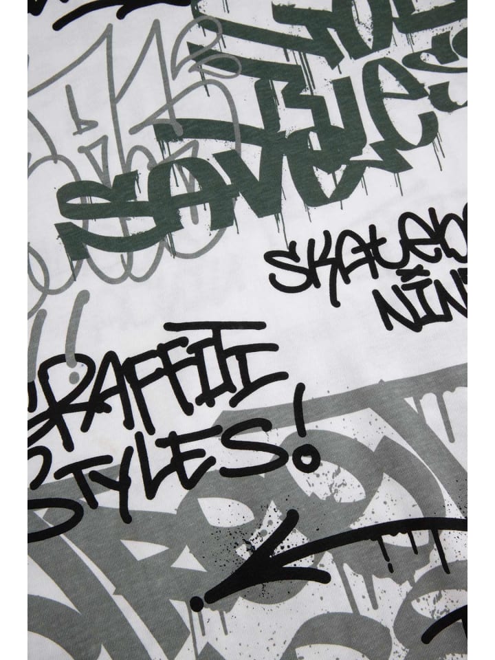 Откройте для себя исключительную хлопковую футболку с короткими рукавами, которая понравится каждому юному любителю городского стиля. Эта белая футболка с динамичным принтом граффити - идеальное сочетание современного дизайна и комфорта. Изготовленная из тонкого, дышащего хлопка, она обеспечивает комфорт в течение всего дня, независимо от активности вашего ребенка.