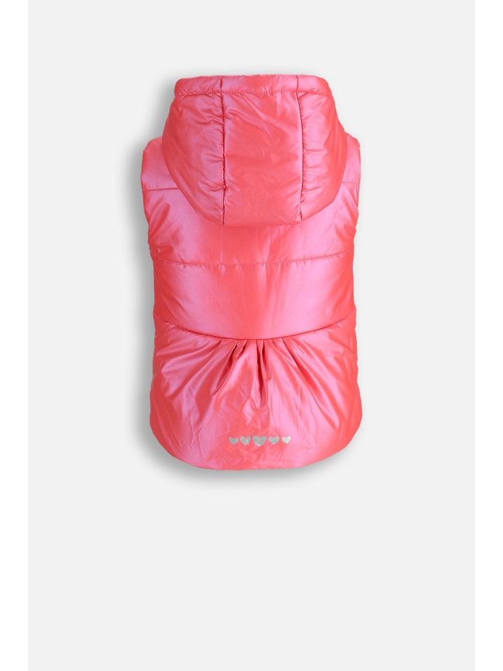 Откройте для себя жилет с капюшоном кораллового цвета, сочетающий в себе функциональность и стиль. Эта стеганая модель обеспечивает тепловой комфорт благодаря утеплителю из переработанных материалов, что делает ее экологичным выбором. Идеально подходит для прохладных дней, когда вашей дочери нужна дополнительная защита от ветра и влаги.