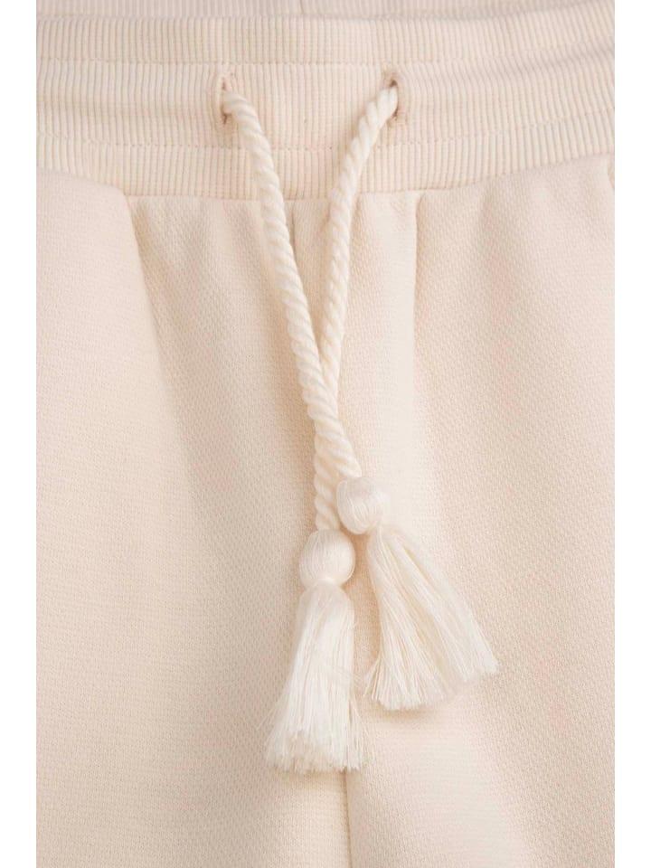 Декоративная резинка вдоль штанин добавляет им утонченного очарования и современного характера. Практичные карманы на штанинах являются дополнительным бонусом для хранения мелких предметов. Эластичный пояс со шнурком обеспечивает идеальную посадку и гарантирует комфорт в течение всего дня.