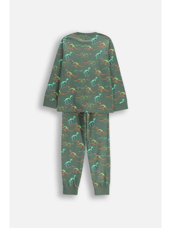 Откройте для себя комфорт и радость сна с нашей пижамой с динозаврами для мальчиков! Этот комплект из двух предметов, выполненный из мягкого и легкого хлопка, обеспечит комфорт на всю ночь. Разноцветный принт с динозаврами по всей поверхности - настоящая изюминка для маленьких любителей доисторических существ. Пижама с изображением динозавров. Благодаря длинным рукавам и штанинам пижама идеально подходит для прохладных ночей, а круглый вырез горловины добавляет классического шарма. Эластичные манжеты и пояс обеспечивают идеальную посадку, не стесняя движений ребенка. Изделие сертифицировано OEKO-TEX, что гарантирует безопасность и отсутствие вредных веществ. Идеально подходит для вечерних приключений в мире снов!