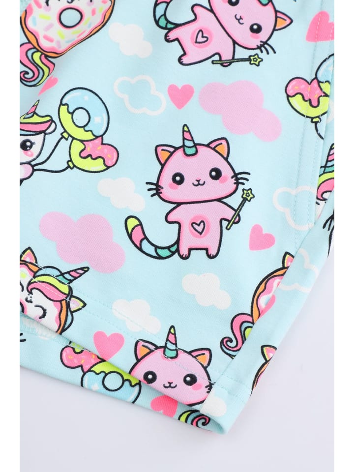 Откройте для себя идеальные летние шорты для вашей маленькой принцессы! Эти милые шорты из тонкого эластичного хлопка обеспечат комфорт и свободу движений во время летних игр. Разноцветный принт с единорогами и кошками на светло-голубом фоне обязательно привлечет внимание и вызовет улыбку на лице вашего ребенка.