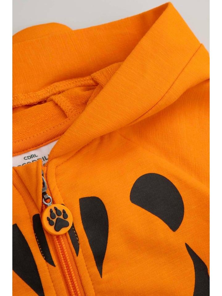 Откройте для себя очарование оранжевой толстовки с тигровым принтом, которая порадует каждого маленького искателя приключений! Эта толстовка с капюшоном и застежкой-молнией - идеальный выбор для летних дней. Она обеспечивает комфорт и свободу движений благодаря эластичной ткани. Милый тигриный принт спереди и декоративные ушки на капюшоне придают ей особый шарм. Оранжевая толстовка с тигровым принтом. Практичные передние карманы вместят мелкие вещи вашего ребенка, а молния позволяет легко надевать и снимать толстовку. Толстовка сертифицирована по стандарту ECO 5B, что гарантирует безопасность и экологичность производства. Идеально подходит для прогулок, игр на свежем воздухе или семейных пикников. Выберите качество и стиль, которые понравятся и детям, и родителям!