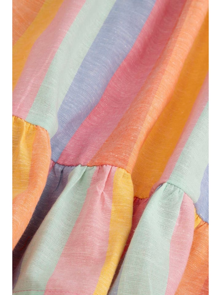 Откройте для себя летнюю элегантность с нашим расклешенным полосатым платьем, идеально подходящим для маленьких девочек от 2 до 7 лет. Это разноцветное платье радует яркими оттенками, которые дарят радость каждый день. Изготовленное из нежной смеси хлопка и льна, оно обеспечивает комфорт и воздухопроницаемость даже в самые жаркие дни.