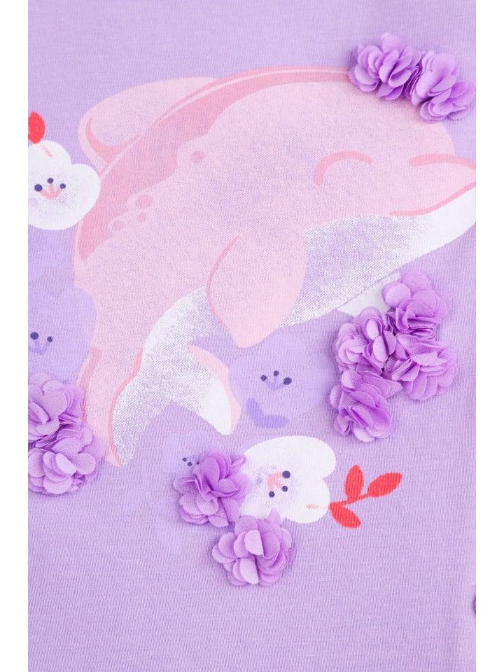 Фиолетовая футболка с короткими рукавами и цветочным мотивом. Откройте для себя очарование этой фиолетовой футболки, которая понравится каждой маленькой девочке. Изготовленная из тонкого эластичного хлопка, она обеспечит комфорт в теплые летние дни. Круглый вырез горловины и короткие рукава делают ее идеальным выбором для повседневных приключений. Уникальный цветочный мотив с объемной аппликацией и нежными оборками добавит очарования и позволит каждой девочке почувствовать себя особенной. Футболка не только красива, но и практична - кнопки на плече позволяют легко надевать и снимать ее. Сертификат ECO 5B гарантирует соответствие изделия самым высоким стандартам безопасности и экологичности. Это идеальный выбор для сознательных мам, которые заботятся о качестве и стиле одежды своих детей. Эта футболка идеально подходит для прогулок, игр в парке или семейных посиделок. Она сочетает в себе функциональность и эстетику, которые оценит каждая маленькая модница.