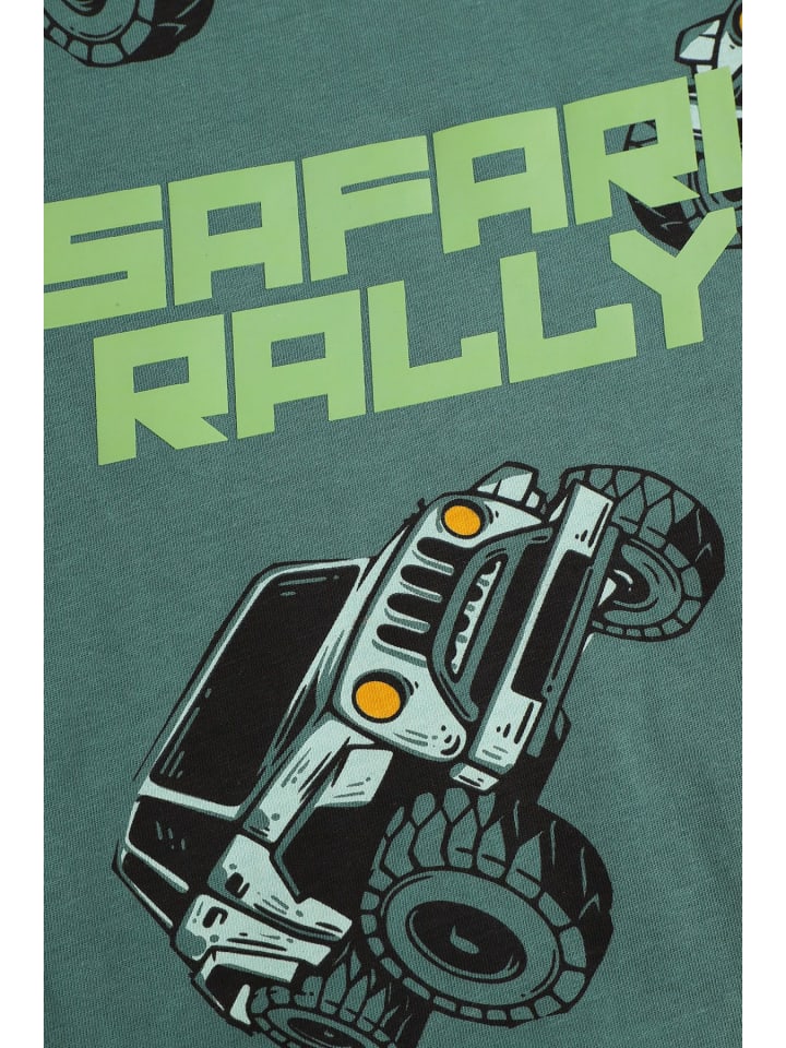 Зеленая футболка с мотивом сафари. Откройте для себя стиль приключений с нашей зеленой футболкой, идеально подходящей для маленьких исследователей. Изготовленная из легкого хлопка, она обеспечивает комфорт и воздухопроницаемость в жаркие летние дни. Мотив внедорожника заряжает энергией и приглашает к приключениям на природе. Круглый вырез горловины и короткие рукава делают футболку удобной и комфортной. Практичные кнопки позволяют легко одеть малышей до 98-го размера. Передняя часть украшена эффектной надписью Safari Rally, которая привлекает внимание и добавляет индивидуальности. Благодаря сертификации ECO 5B вы можете быть уверены, что выбираете безопасный и экологичный продукт. Эта футболка идеально подходит для повседневных приключений и игр, она станет идеальным выбором для мальчиков от 2 до 7 лет, которые любят автомобильную тематику и активный отдых.
