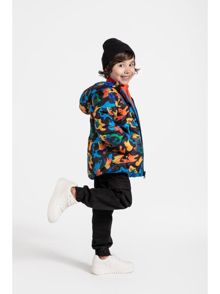 Переходная куртка для мальчиков. Капюшон и карманы. Сплошной принт. Двусторонняя куртка для мальчиков. Откройте для себя исключительную куртку из коллекции OUTERWEAR BOY KIDS, которая сочетает в себе практичность и игривый детский стиль! Эта двусторонняя куртка - идеальное решение для переменчивой погоды. Одна сторона куртки украшена оригинальным принтом динозавра, который обязательно понравится маленьким поклонникам доисторических существ и придаст куртке отличительный характер. Другая сторона имеет более универсальный принт, что делает куртку еще более универсальной. Оснащенная практичным капюшоном и вместительными карманами, куртка отлично защищает от ветра и холода, а также позволяет хранить мелкие предметы. Преимущества продукта: Водонепроницаемость - благодаря специальной мембране она защищает от воды глубиной до 600 мм, дополнительно усиленной гидрофобным покрытием WR, которое обеспечивает стекание воды с материала. Ветрозащита - защита от ветра обеспечивается мембраной и капюшоном куртки. Воздухопроницаемость: мембрана отводит излишки тепла наружу, уменьшая потоотделение и обеспечивая тепловой комфорт. Функциональность: двусторонняя модель, капюшон, карманы, светоотражающие элементы, молния, защита верхнего края молнии.