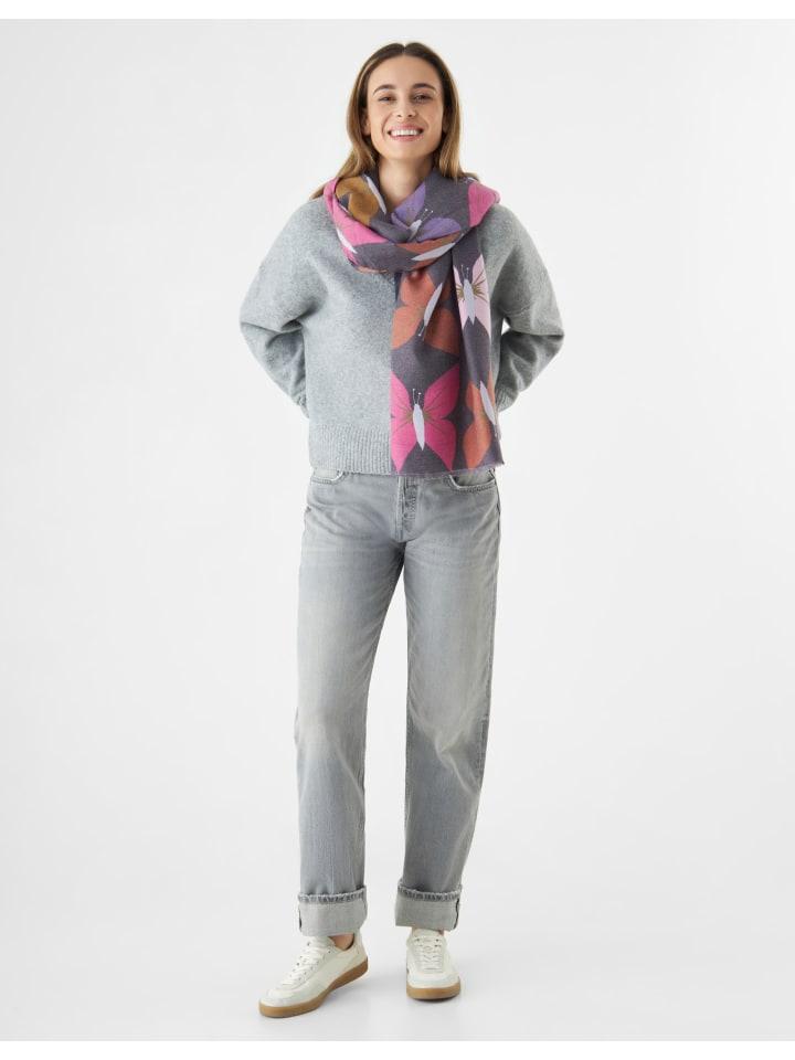 Этот шарф словно уютное объятие. Он сшит из нашей невероятно теплой, самой популярной ткани и украшен принтом в виде разноцветных бабочек по всей поверхности. Его можно носить как акцент в первые прохладные дни с толстыми свитерами для активного отдыха, джинсами или тренчами.