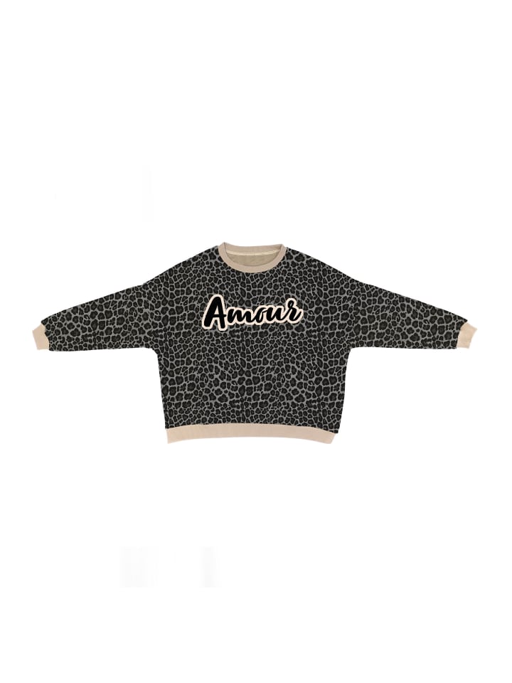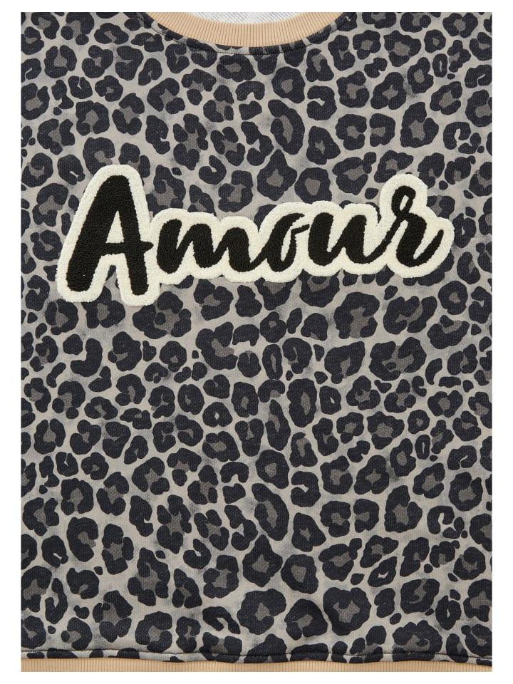 Модницы в восторге от нашей стильной и удобной толстовки с леопардовым принтом. Этот свободный джемпер украшен эффектной аппликацией Amore, круглым вырезом контрастного цвета, длинными рукавами с контрастными манжетами и широким поясом в резинку контрастного цвета.