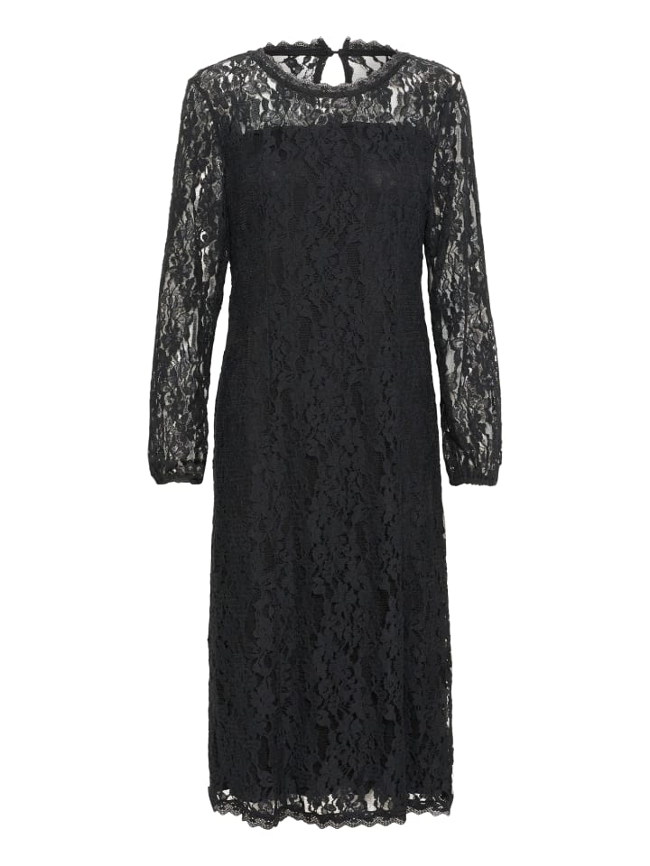 Это кружевное платье миди прямого силуэта с круглым вырезом и длинными прозрачными рукавами. Низ изделия отделан фестончатой тканью.