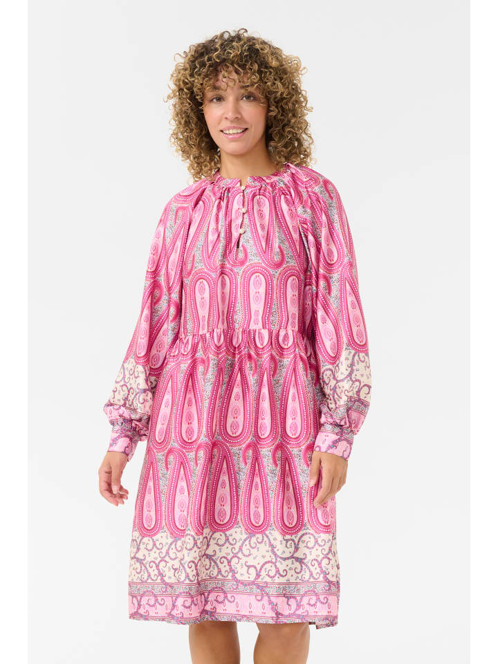 Платье свободного кроя с эластичной талией, присборенным круглым вырезом на пуговице, длинными рукавами и гладкой отделкой.